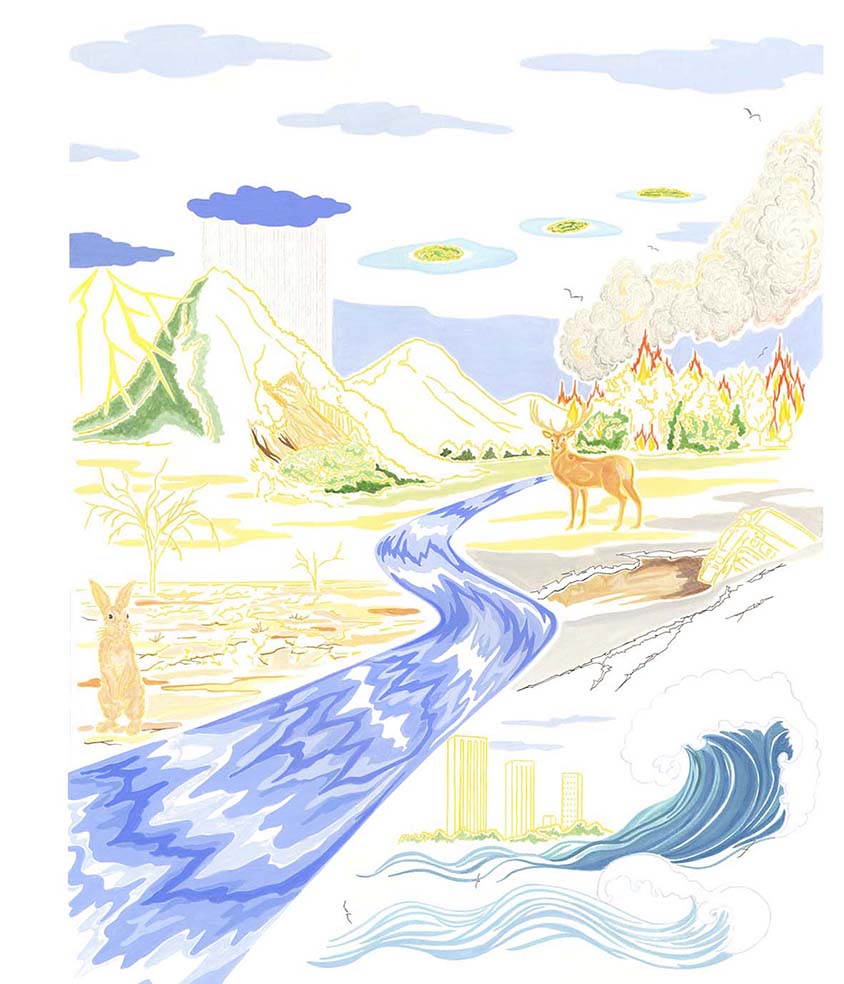 津波、洪水、干ばつ、海水上昇、森林火災、大雨を描いています。